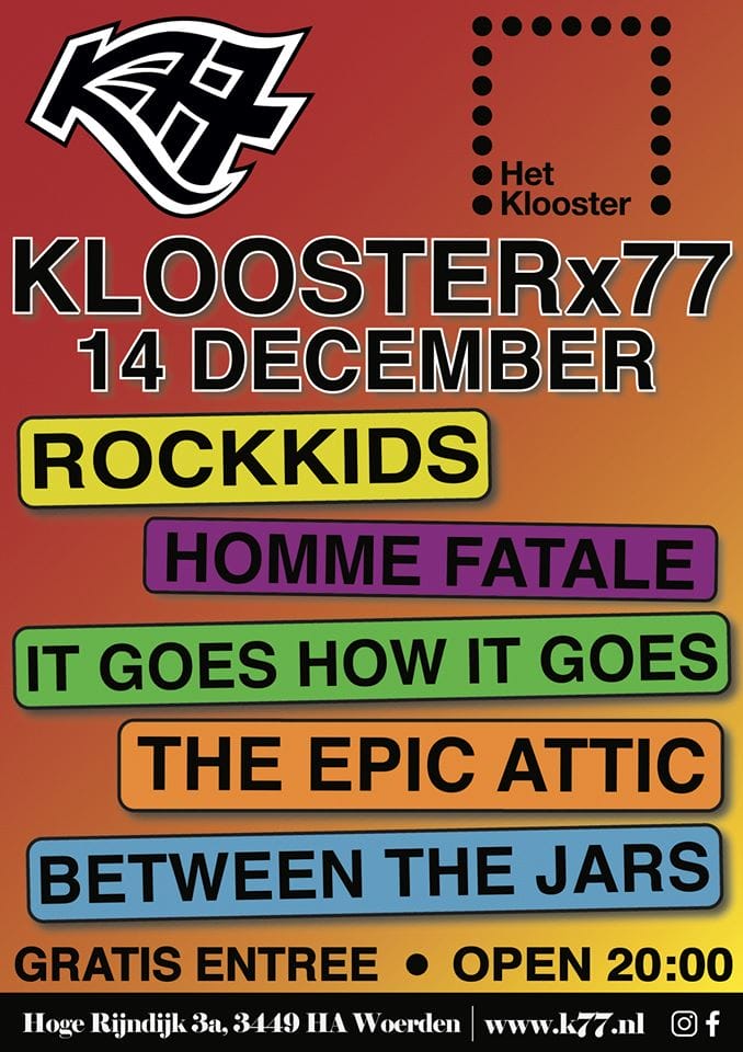 Voor het eerst heb ik met Rockkidz buiten het Klooster opgetreden. Met een paar andere bands van het Klooster mochten we optreden bij K’77 in Woerden, een jongerensociëteit waar veel beginnende bandjes optreden. Toen we binnenkwamen kreeg iedereen die kwam om op te treden een muntje voor een biertje, maar we mochten het muntje alleen inruilen voor frisdrank. We waren wat jonger dan de bandjes die hier normaal op optreden.