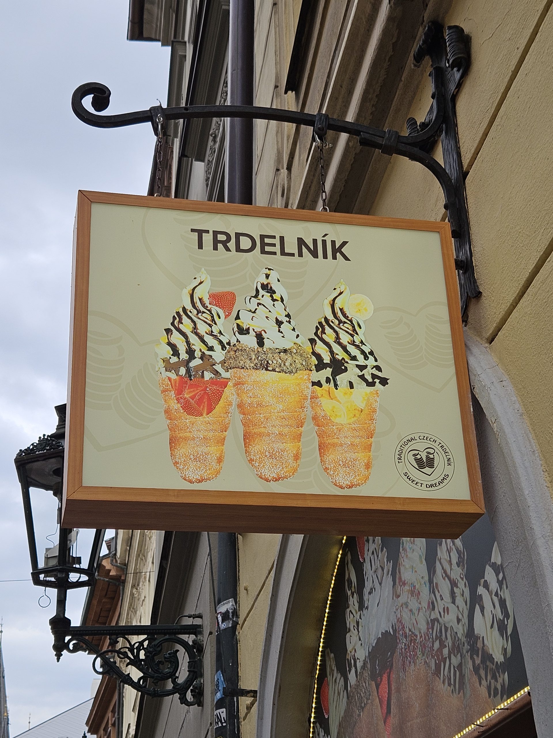 Dan komen we uit bij de Karlsbrug, waar we gistermiddag ook al even waren. Bij een Ierse Pub vinden we een tafeltje met airco en drinken een verkoelend drankje. Het is nu echt de hoogste tijd voor de Trdelník die we al een paar keer hebben gezien en geroken. De Trdelník is een Midden-Europees gebak in de vorm van een koker. Deze lekkernij komt uit Hongarije, Slowakije en Tsjechië. De cake wordt om een stok gewikkeld en boven een vuurtje gebakken. Wij laten de cake vullen met ijs. Dit is wel heel lekker!