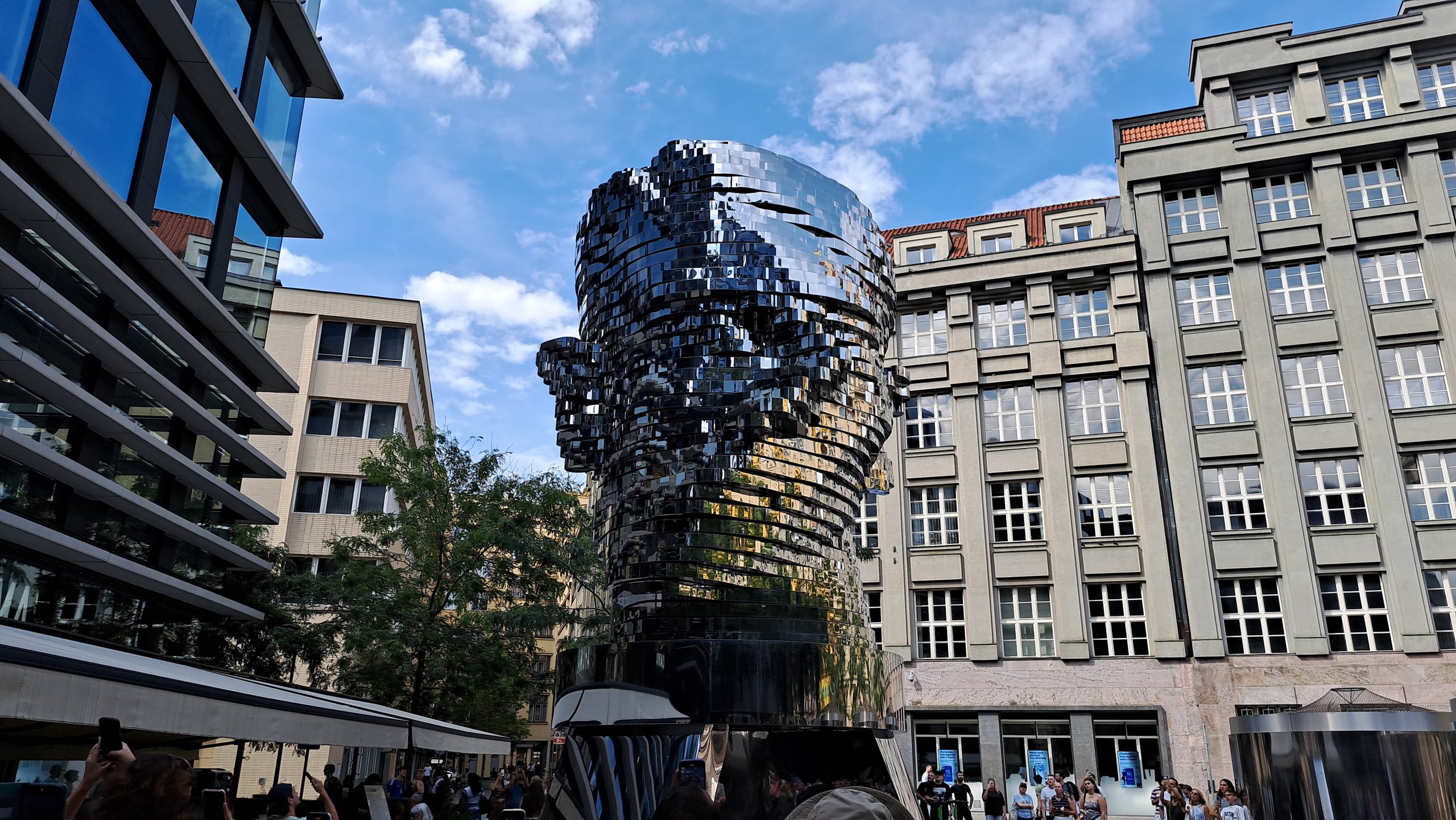 Na de rondvaart nemen we de tram richting ons hotel en stappen uit bij de shopping Mall Quadrio. Nadat we een lekker verkoelende Bubble Tea hebben gehaald, gaan we buiten op zoek naar het kunstwerk ‘Roterend Hoofd‘ van Franz Kafka. Het bijna elf meter hoge kunstwerk stelt het hoofd van Franz Kafka voor. Het hoofd bestaat uit 42 roestvrij stalen platen die afzonderlijk van elkaar kunnen bewegen. Ieder uur draait het hoofd gedurende 15 minuten in verschillende standen, waarna het weer in de oorspronkelijke vorm eindigt.