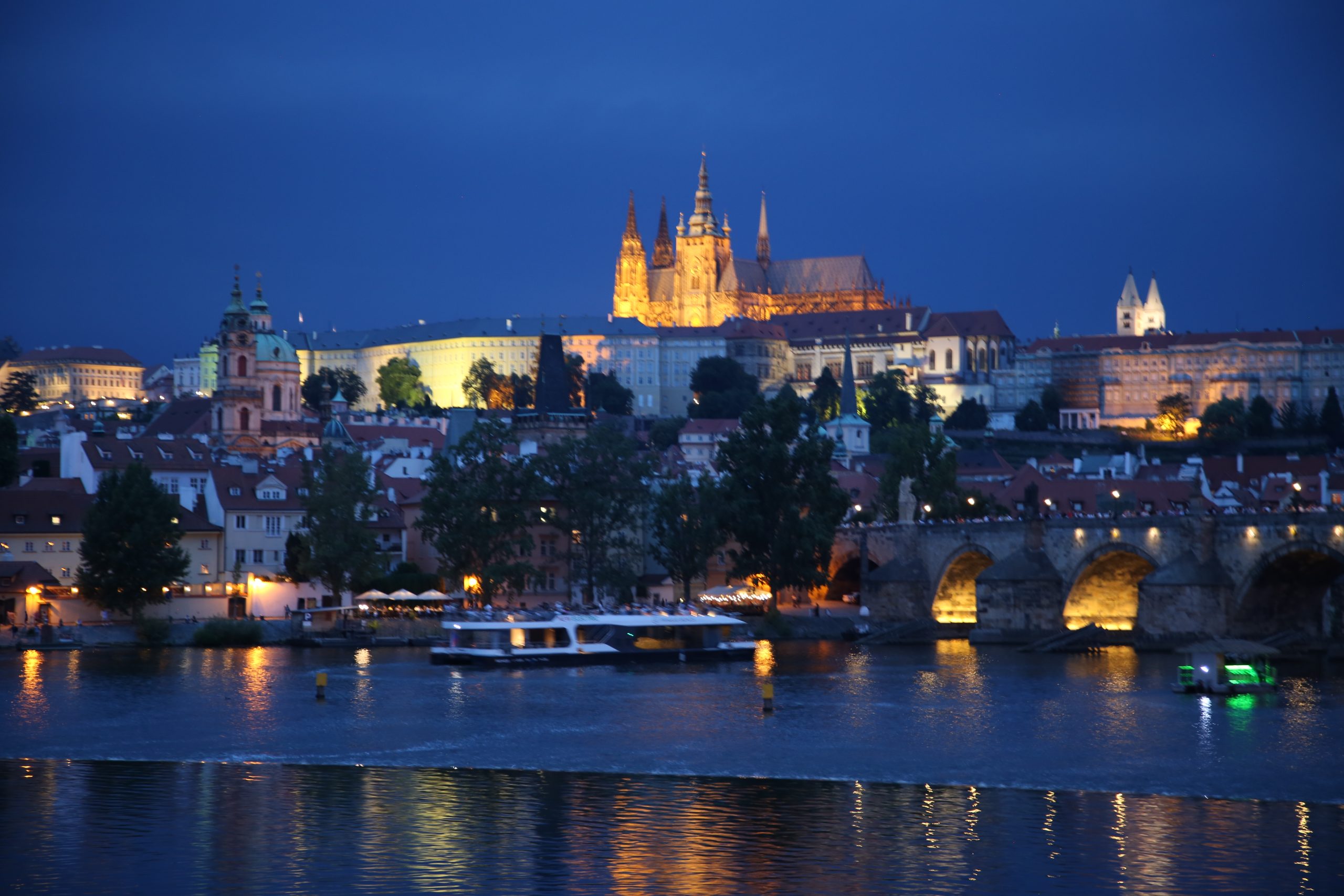 Met de buiken vol nemen we de tram naar de Karlsbrug. We wachten tot het donker is, zodat we een prachtig uitzicht hebben op de verlichte Karlsbrug en de burcht.