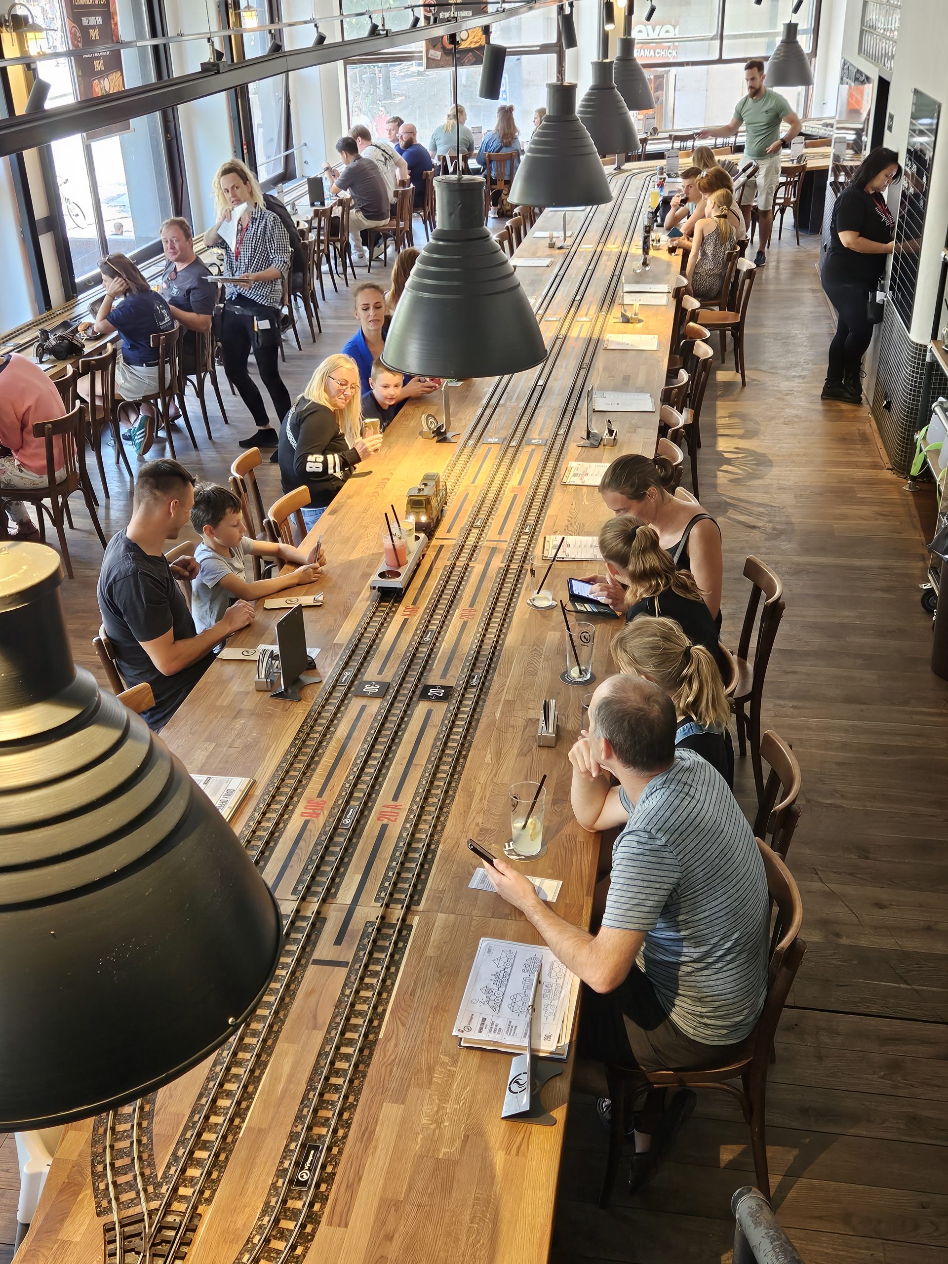 We gaan op zoek naar het Výtopna Railway Restaurant. Dit is echt een restaurant voor opa Jan. Drankjes worden hier namelijk gebracht door een klein treintje dat langs de tafels rijdt. Eigenlijk is de treinbaan een lange tafel met de rails in het midden.