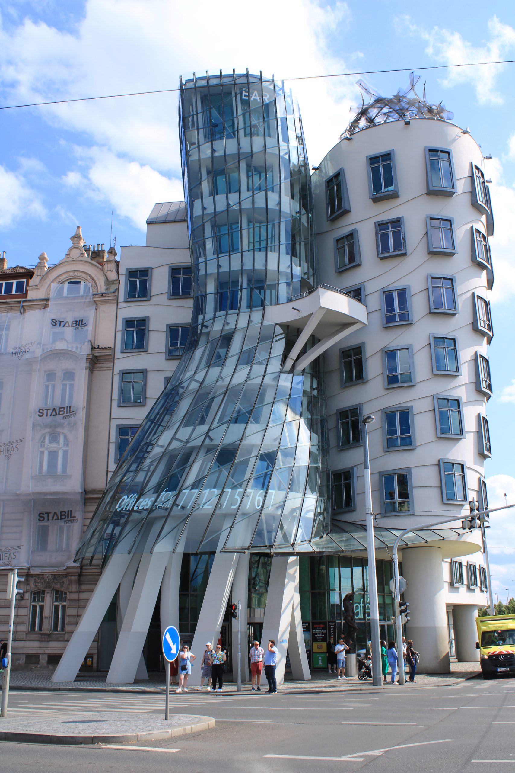 Op de terugweg naar het hotel stappen we uit de tram bij het Dansende huis (Tančící dům) in de Nieuwe Stad. Het is ontworpen door de beroemde architecten Frank Gehry en Vlado Milunić. Doordat er geen rechte lijnen in het gebouw zitten, lijkt het alsof het dans. Echt mooi vinden we dit gebouw niet. Wij zijn duidelijk meer fan van de historische gebouwen in Praag.