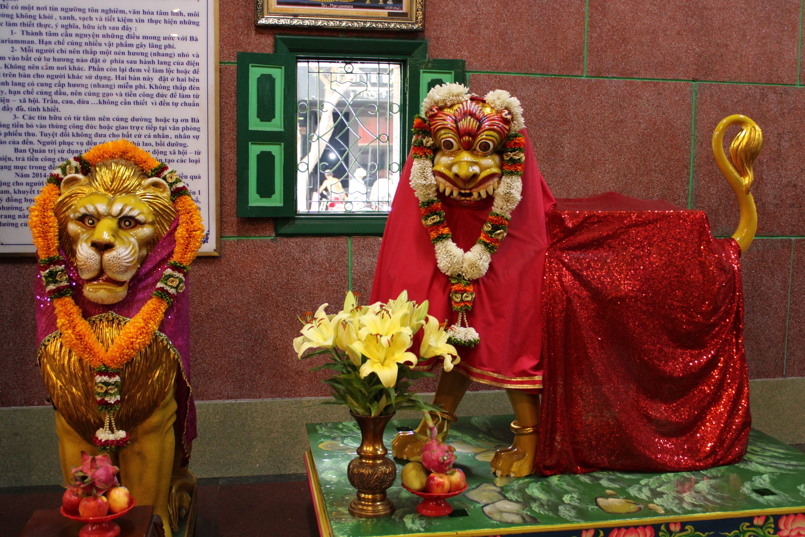 We trekken onze schoenen uit en lopen een rondje door de tempel. We zien daar een paar dames in gebed. Na het bidden krijgen ze van de priester een bindi (rode stip) op het voorhoofd. Ook zien we een beeld van een leeuw en een draak, beiden met een bloemenkrans om de nek. In het Boeddhisme betekent de leeuw de wijsheid van Boeddha’s leer.