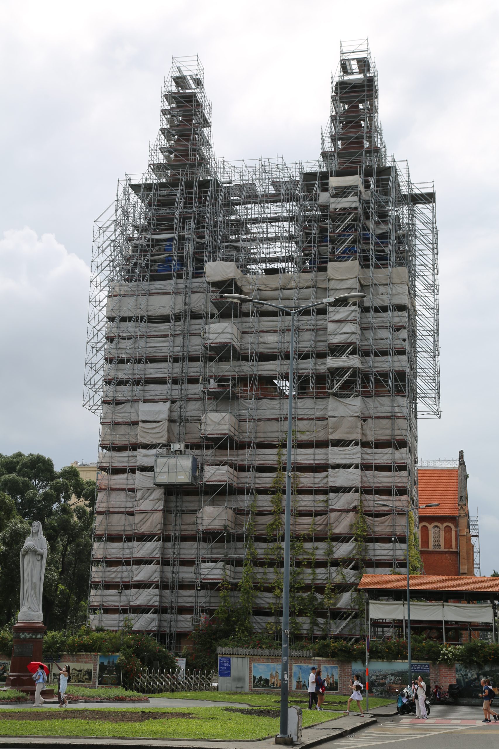 De Saigon Notre Dame Cathedral, tussen 1863 en 1880 gebouwd door de Fransen, staat helaas tot 2027 in de steigers vanwege een renovatie die al een aantal jaren duurt. Op de plaatjes in onze reisgids ziet deze kathedraal er prachtig uit.
