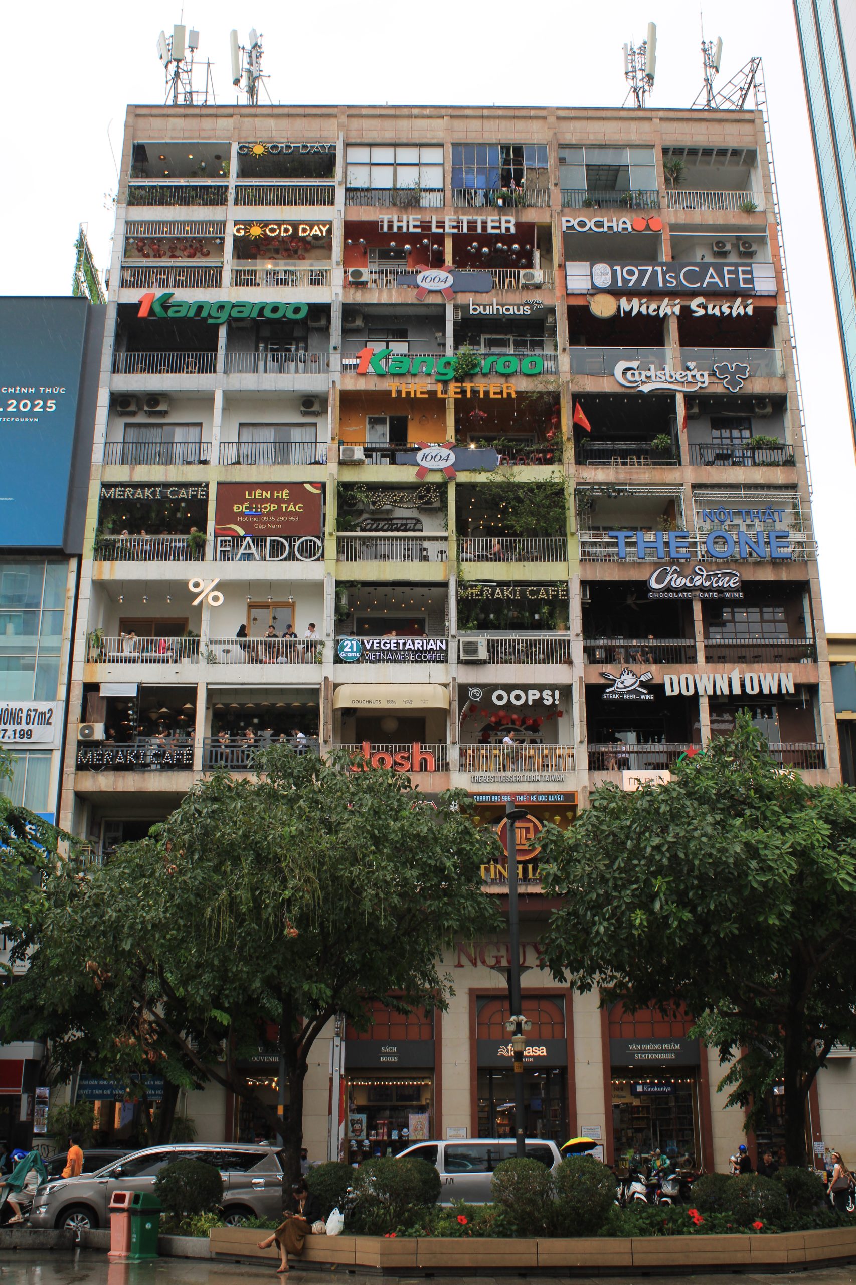Als we weer teruglopen door de Nguyen Hue Walking Street, stoppen we bij het Cafe Appartements gebouw waar we een pauze nemen. Van buiten ziet het eruit als een flatgebouw van ongeveer 8 etages, alleen zit in iedere ‘woning’ een café met een klein balkon. Via een smalle ingang achter een scooterverhuur, moeten we naar binnen. Tegen betaling kunnen we de lift nemen, maar er is ook een trap.