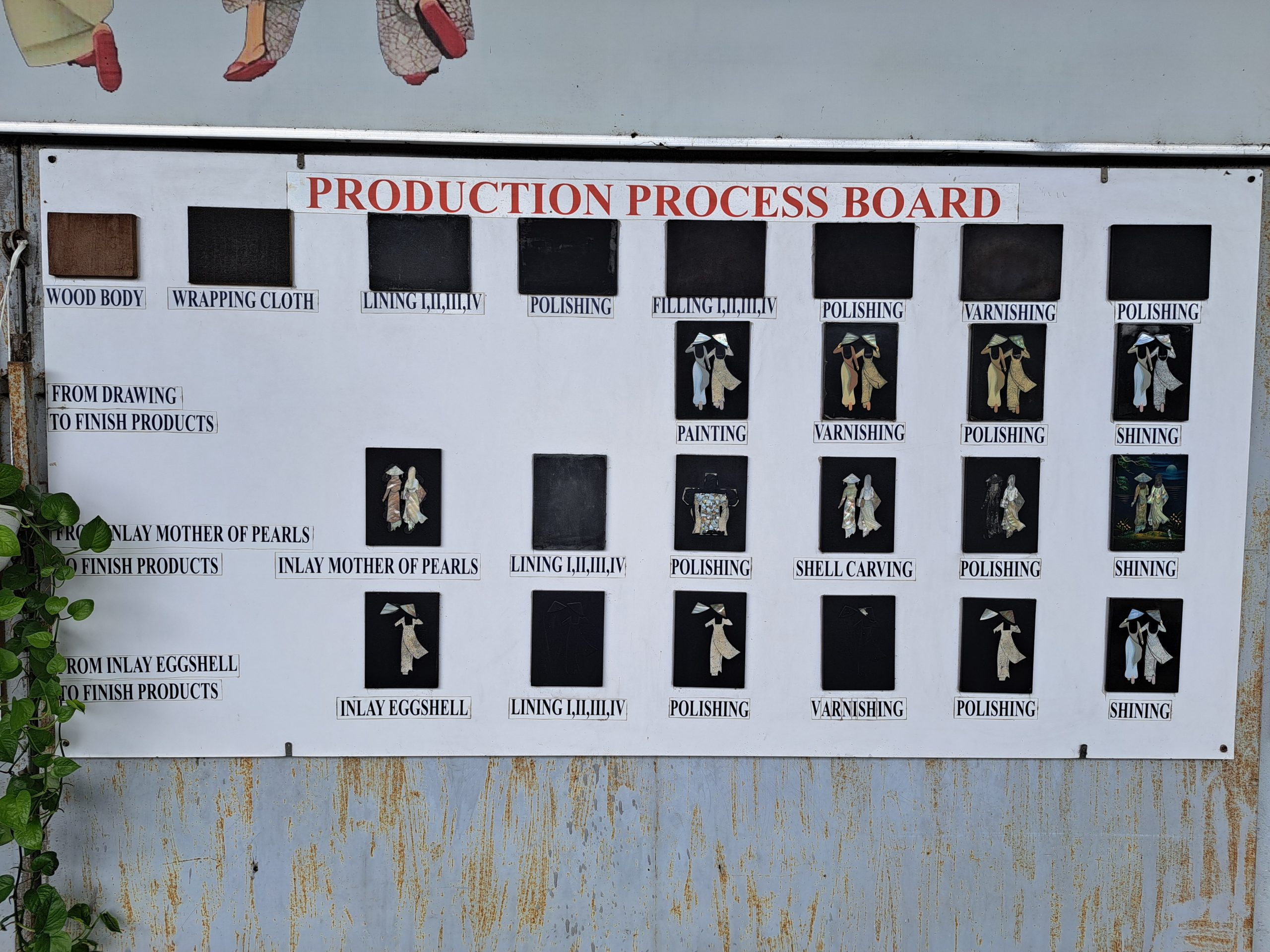 De mensen van de werkplaats maken prachtige kunstwerken. Ze beginnen met een houten plank die ze bewerken en polijsten. Vervolgens maken ze met minuscule stukjes van een eierschil en met kleine stukjes van schelpen, prachtige landschappen of dieren op het hout. Vervolgens doen ze er nog meer mee, met als resultaat prachtige kunstwerken. Ze zijn er heel lang mee bezig. We kopen een klein kunstwerk en horen dat ze daar 2,5 weken mee bezig zijn geweest.