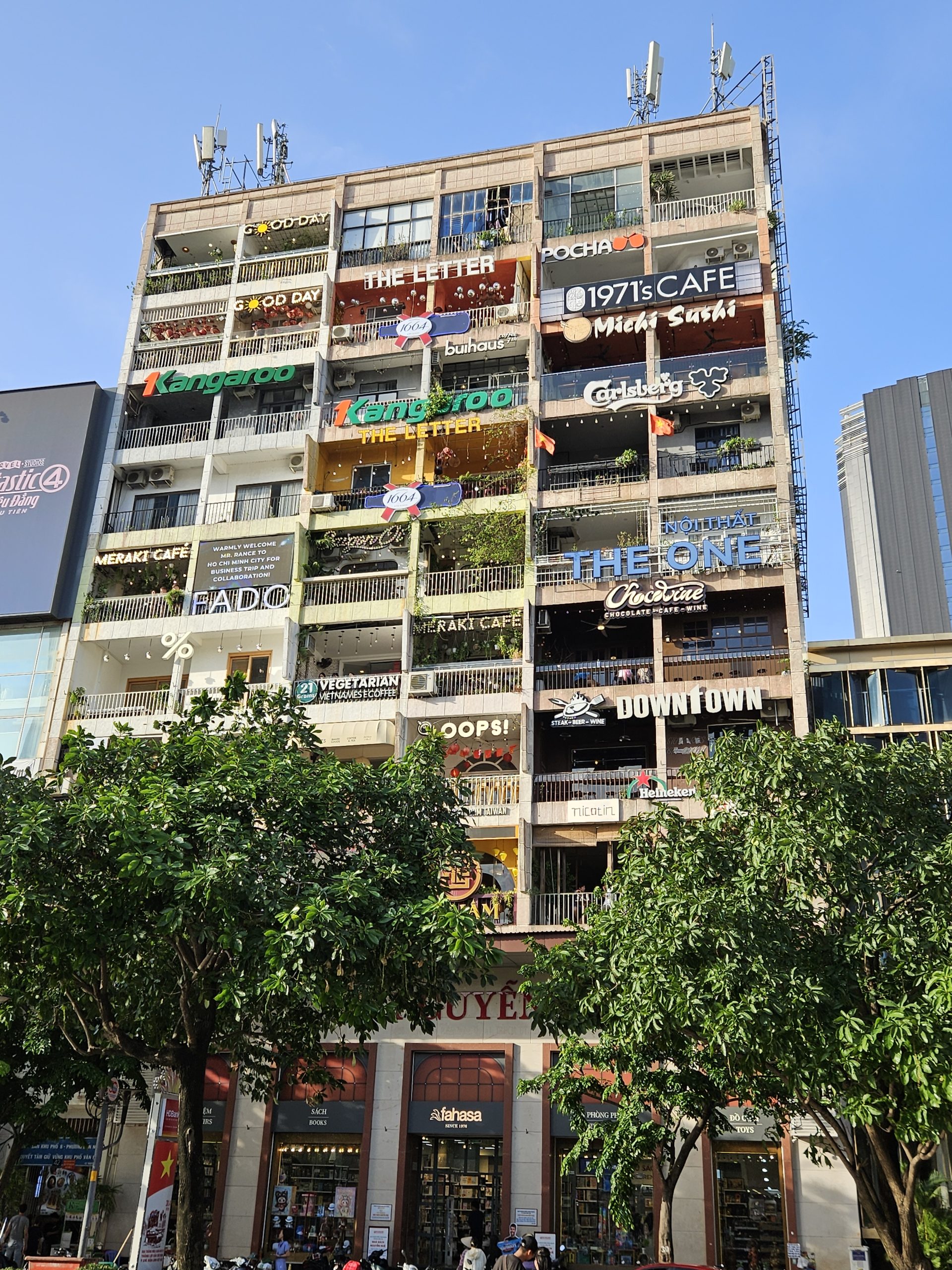 Na wat rondlopen vinden we een leuke rooftopbar op de 8e etage van een hotel, The View. Als we boven komen, horen we dat er nog 10 minuten happy hour is. Daar maken we natuurlijk dankbaar gebruik van. Vanaf de rooftopbar hebben we een goed uitzicht over de verlichte skyline van Hồ Chí Minh City.