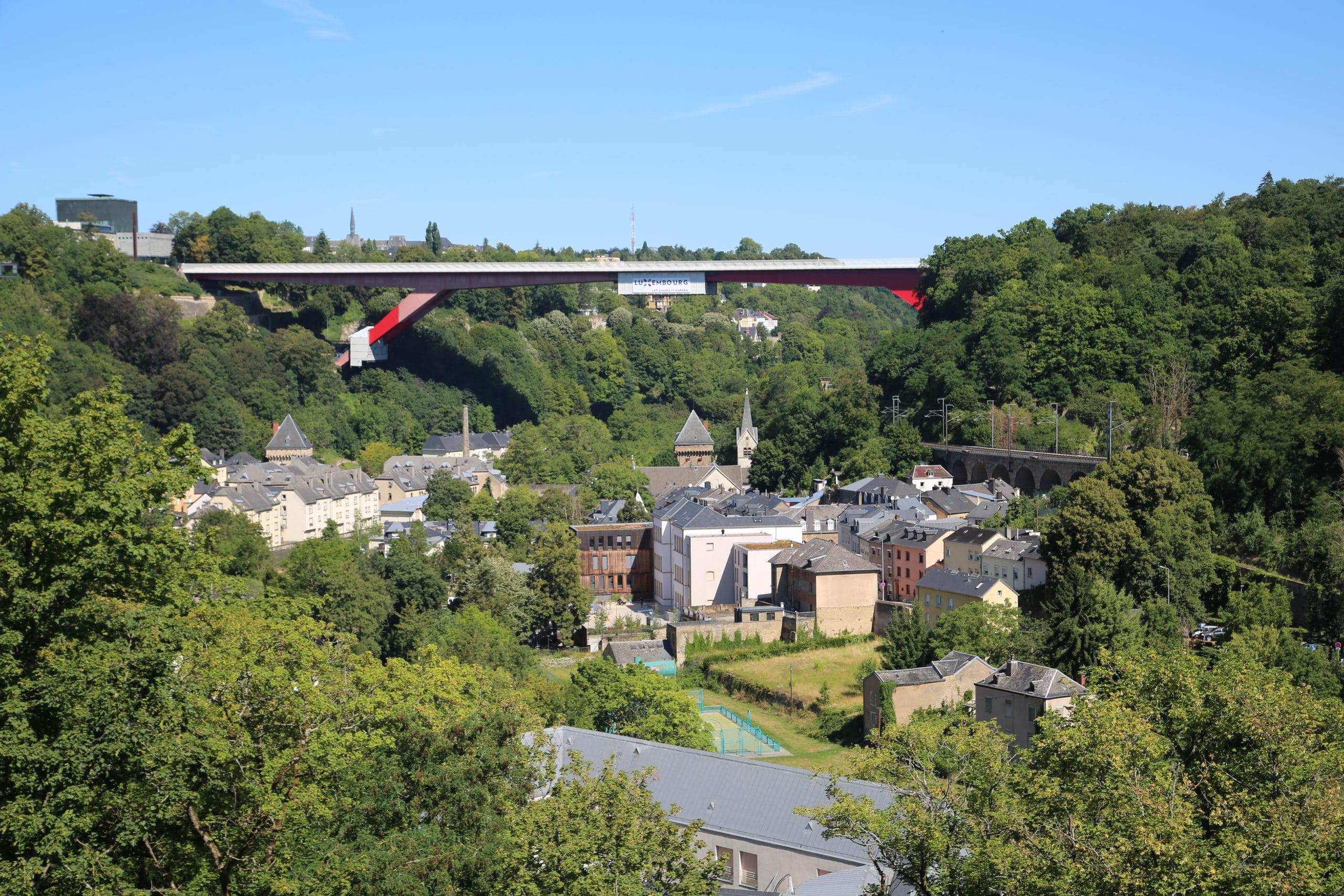 2020 Luxemburg: uitzicht vanaf Montée de Clausen op de rode Pont Grande-Duchesse Charlotte