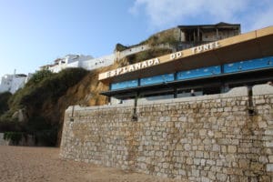 2013 Algarve: Albufeira, lekker restaurant met vanaf het terras uitzicht op zee.
