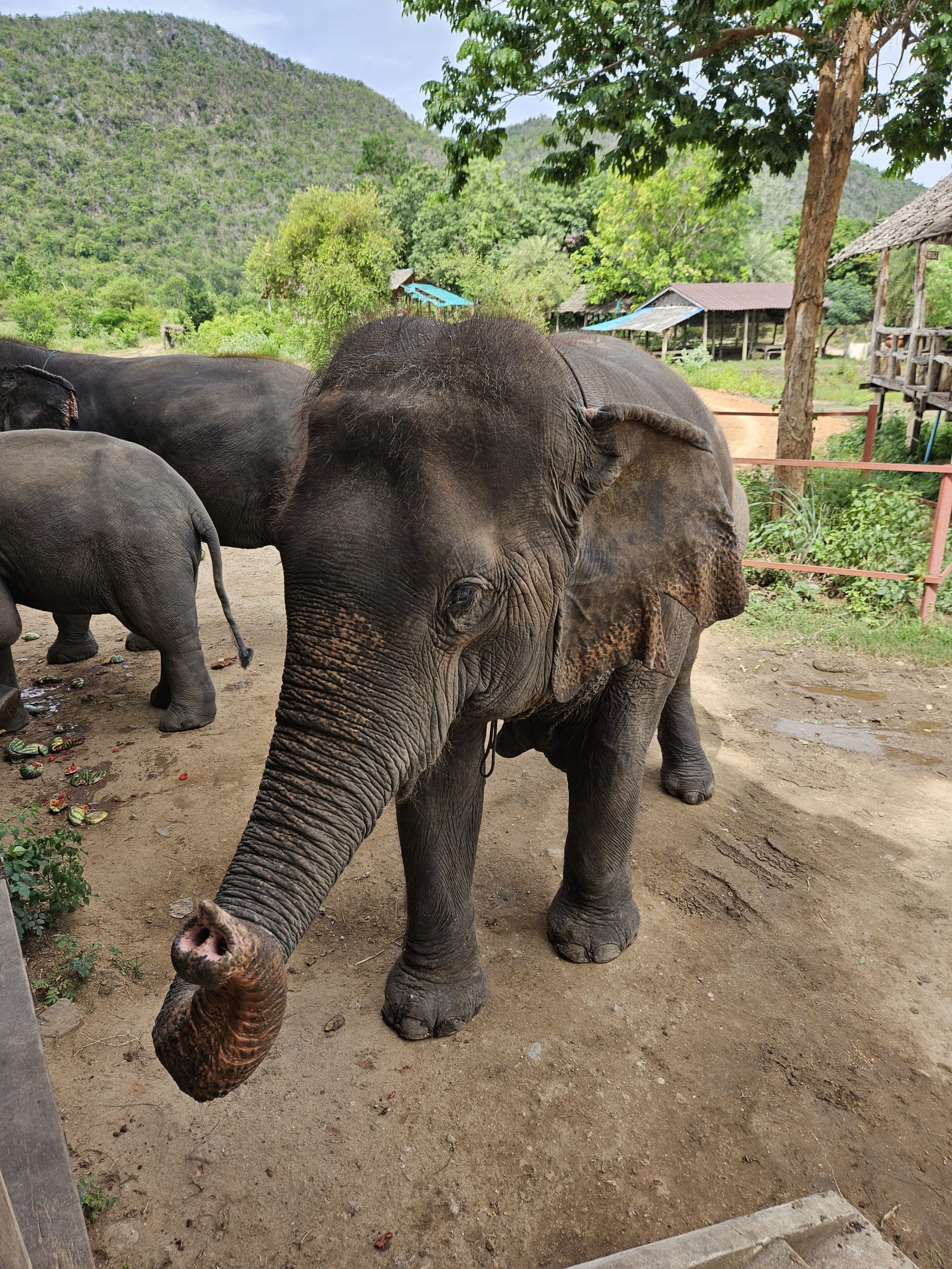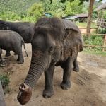 Iets verderop staat er een 79-jarige olifant zonder tanden. We mogen meehelpen om voor dit hoogbejaarde dier speciaal eten te bereiden. We moeten stukken pompoen, een bruin prutje en gesneden bananengras kneden en er vervolgens grote ballen van maken. De oude olifant opent zijn mond en we kunnen de ballen zo naar binnen schuiven.