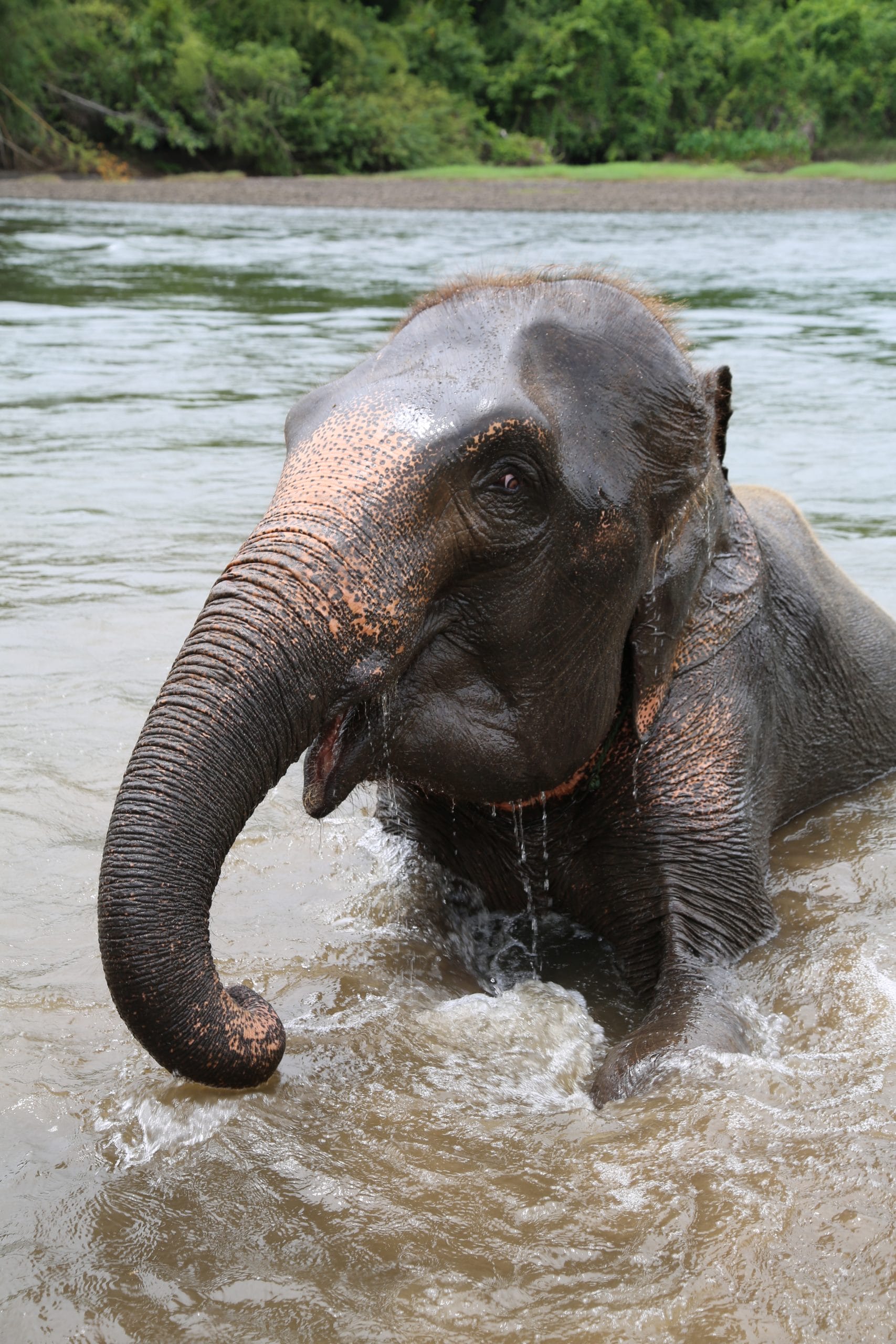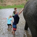 Dan is het tijd voor het hoogtepunt van deze dag. We mogen met de olifanten mee in het modderbad. Ze vinden het heerlijk om ingesmeerd te worden met modder. Zelf blijven we ook niet helemaal schoon. De modder moet natuurlijk ook weer van de olifanten af. We brengen de olifanten naar de rivier voor een bad. We krijgen allemaal een bezem om ze te poetsen. Ondertussen zorgen de olifanten regelmatig voor een fontein met hun slurf, dus ook wij frissen weer een beetje op.