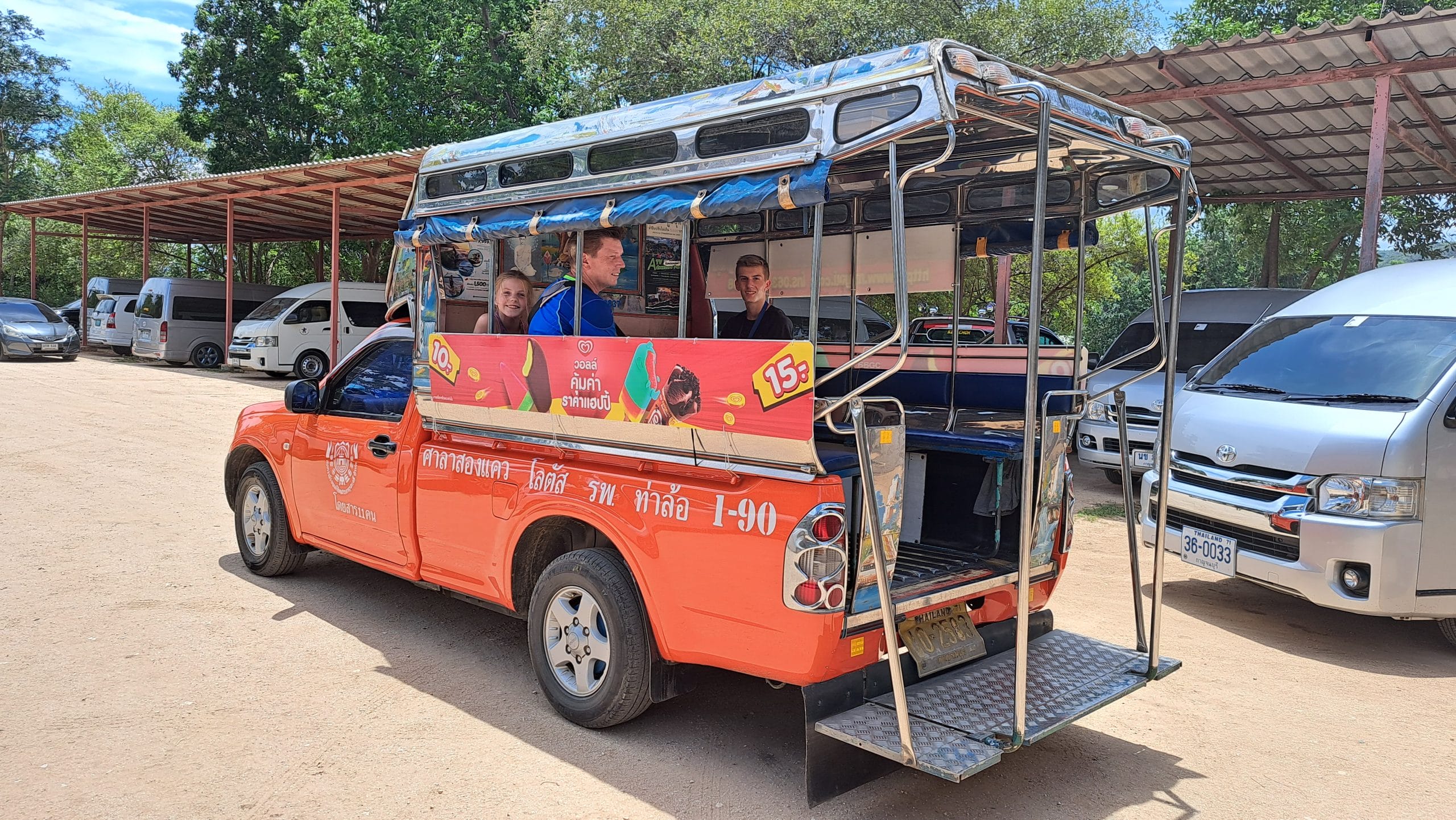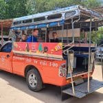Als we terugkomen kunnen we zelf douchen en staat er een lunchbuffet voor ons klaar. Ondertussen is het al 13:00 uur geworden en worden we met een songthaew teruggebracht naar ons guesthouse. Songthaew betekent letterlijk ‘twee rijen’ en heeft deze naam gekregen omdat je achterin dit voertuig twee rijen banken hebt waarop je kunt zitten. Deze gedeelde taxi’s rijden door de hele stad en je spreekt vooraf een prijs af per persoon. Er zitten ook mensen in de songthaew die je niet kent. Je deelt de taxi immers. Ze hebben geen vaste routes en rijden normaal simpelweg waar hun passagiers naartoe moeten.