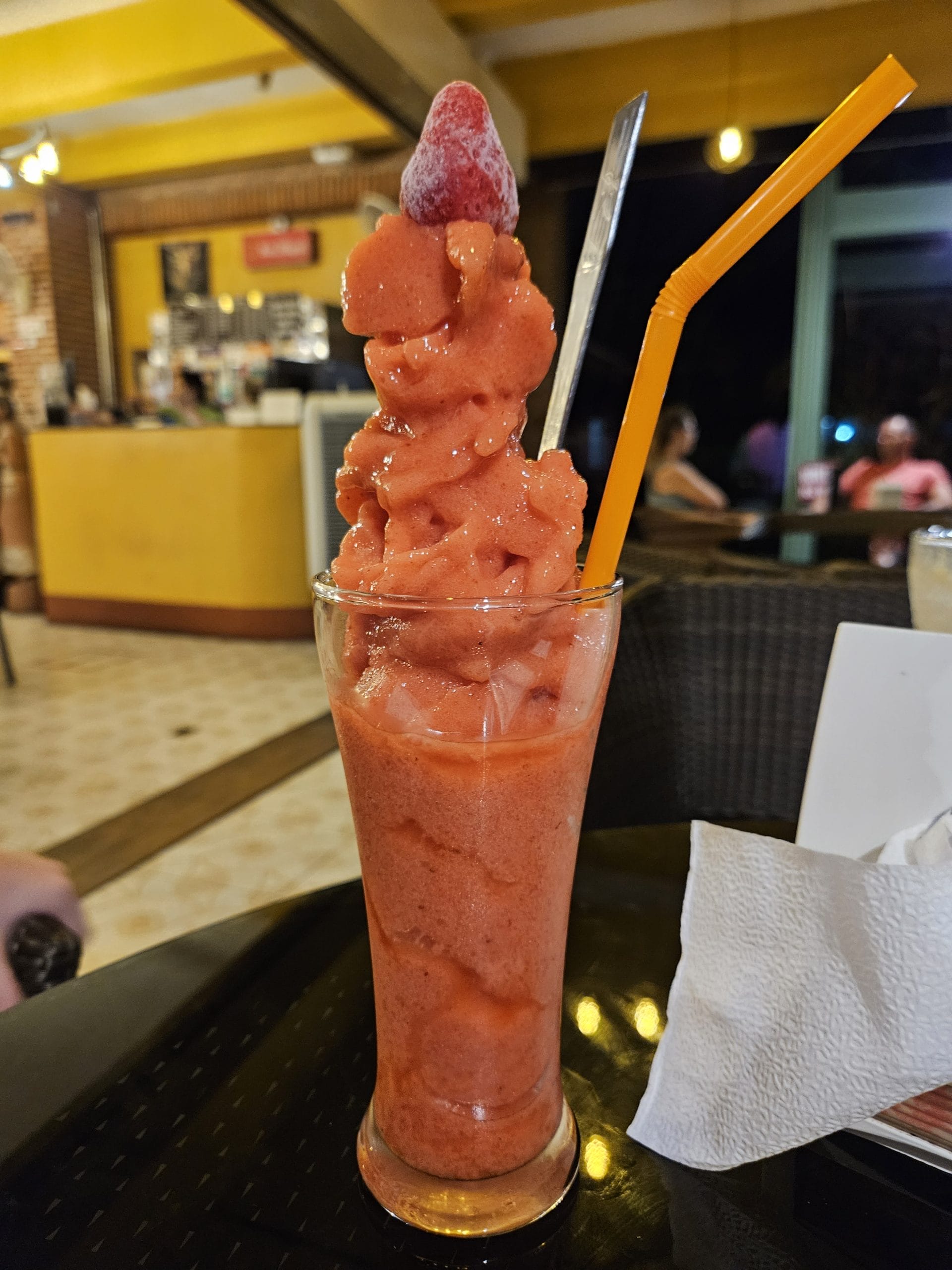 Het is alweer de laatste avond in Kanchanaburi. We eten nog een keer bij ons guesthouse en genieten na met een ijskoffie en fruitshake. Wat hebben we het getroffen met dit enorm leuke guesthouse. We zijn het er allemaal over eens dat het hoogtepunt tijdens ons verblijf in Kanchanaburi de excursie naar de olifanten was. Dat zullen we niet snel vergeten.