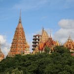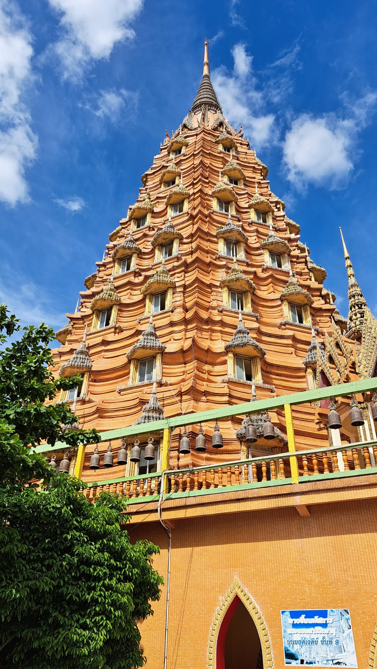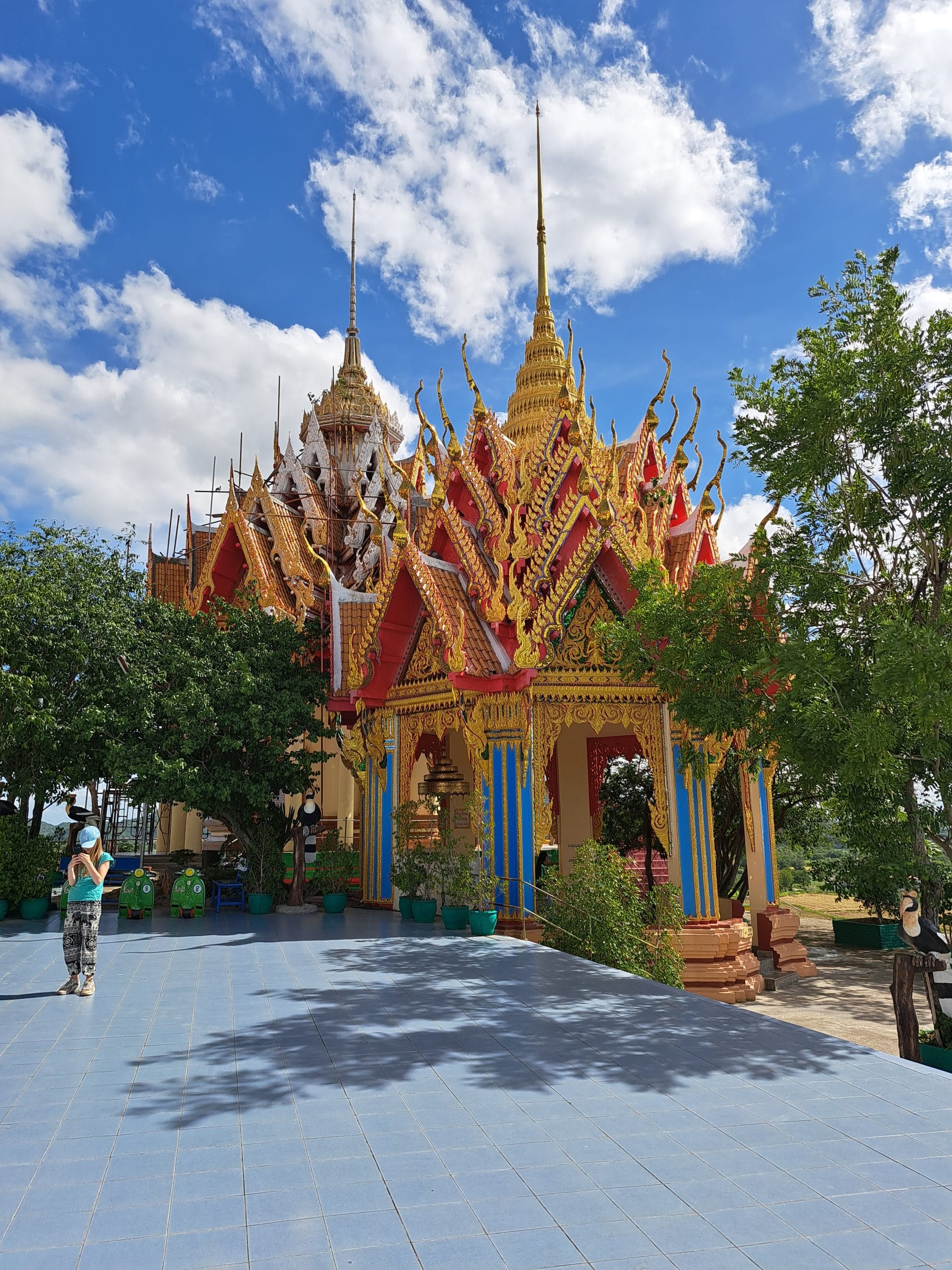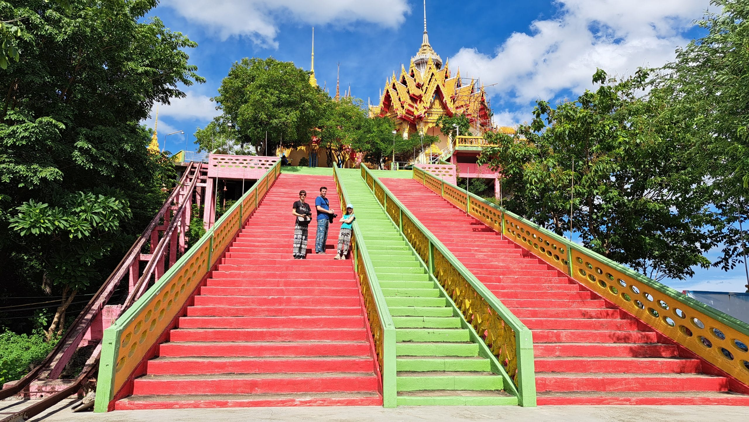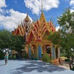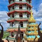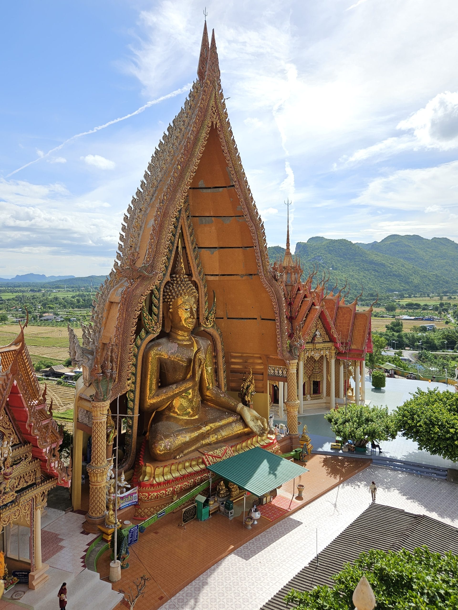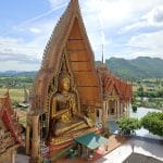 Terug in het hotel hebben we erge trek in een fruitshake. Ze zijn hier ook zo lekker. Als we een beetje op temperatuur zijn gekomen, bestellen we een Grab om ons naar de Wat Tham Suea (Tiger Cave Temple) te brengen. Dit enorme tempelcomplex ligt op een half uurtje rijden van het guesthouse, net buiten de stad. De Wat Tham Suea staat op een plateau. Om boven in de tempel te komen moeten we eerst 150 traptreden beklimmen. Boven aangekomen hebben we vanaf het plateau een mooi uitzicht op de vallei waarin Kanchanaburi ligt. Verspreid over het tempelcomplex staan een aantal kleinere tempels, een pagode van acht verdiepingen hoog en een enorm Boeddhabeeld van bijna 70 meter. Een pagode is een toren die uit verschillende, steeds kleiner wordende verdiepingen met een eigen dak bestaat. Pagodes zijn in veel boeddhistische tempels in Thailand te zien. We kunnen via smalle wenteltrappen in de pagode bijna helemaal boven komen. Hier kunnen we het enorme beeld in zijn geheel fotograferen, wat een heel mooi plaatje oplevert.