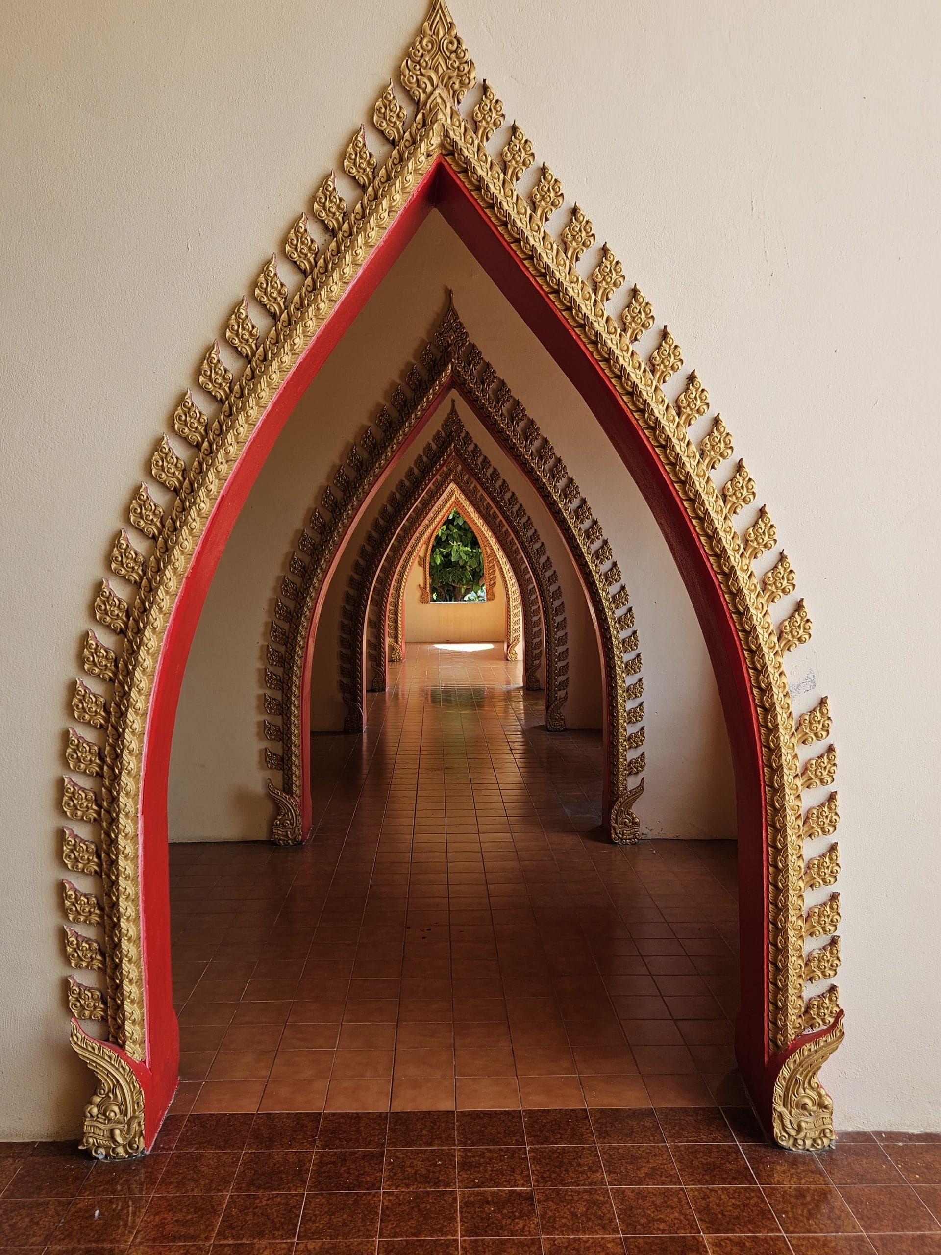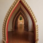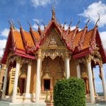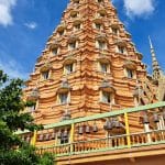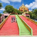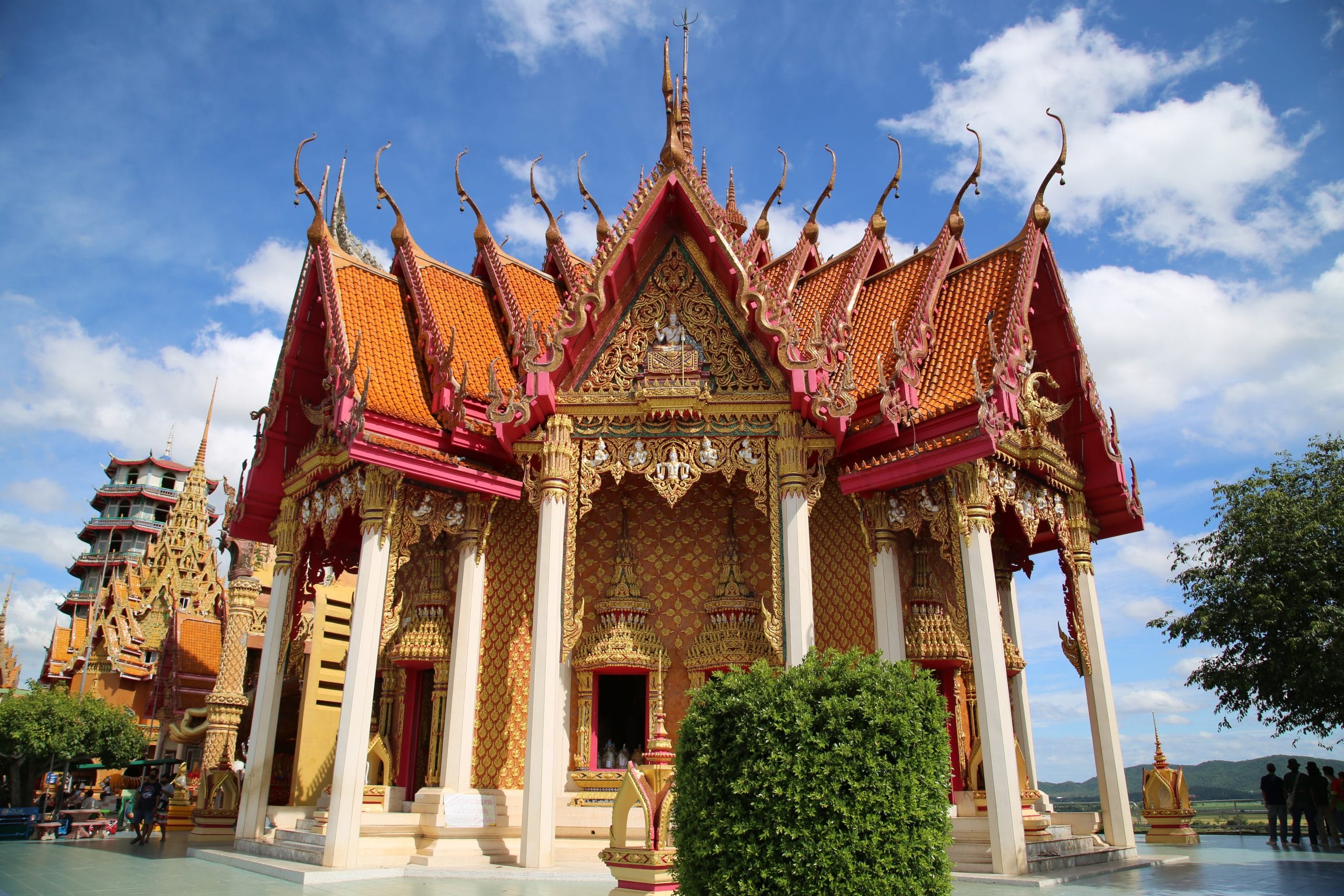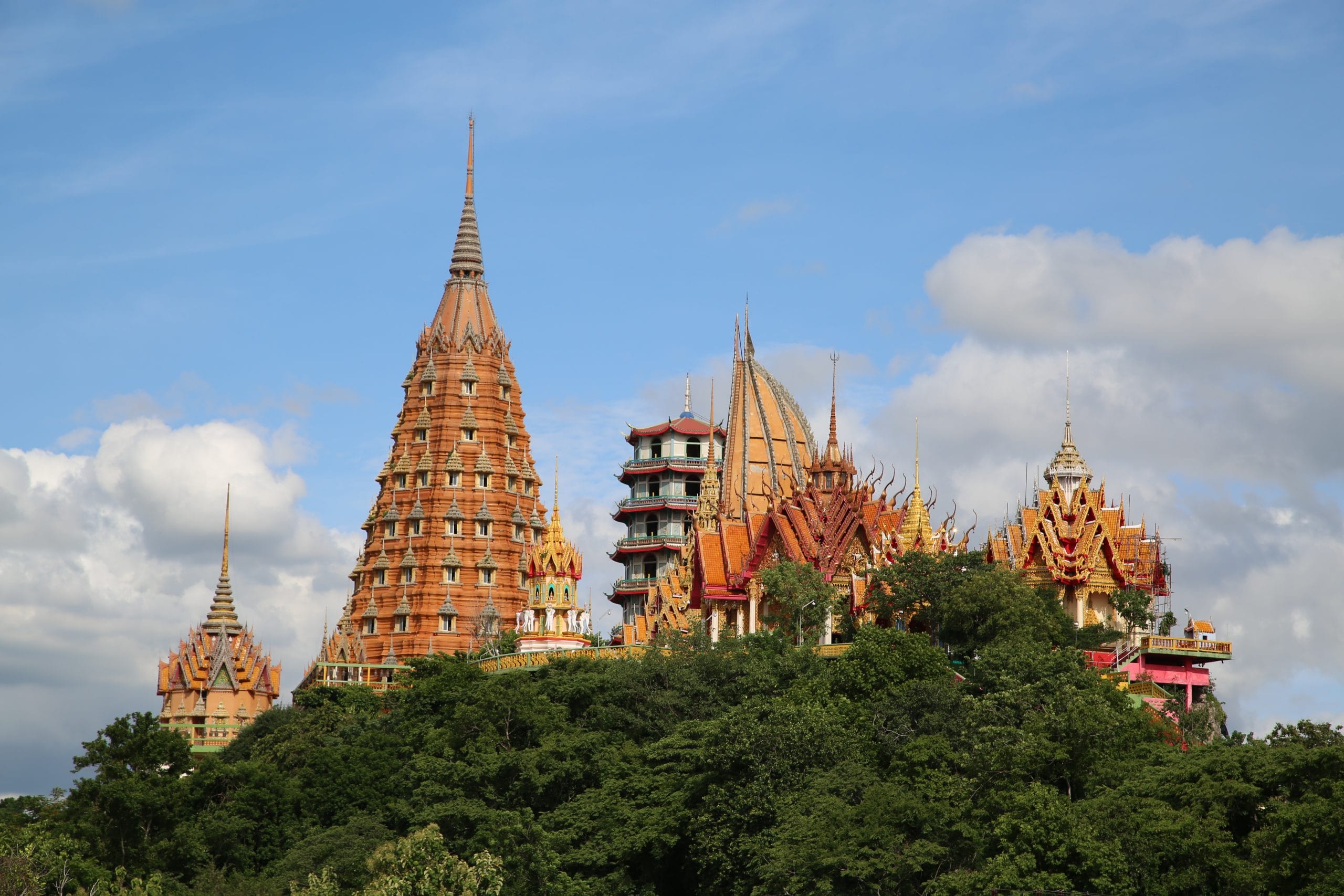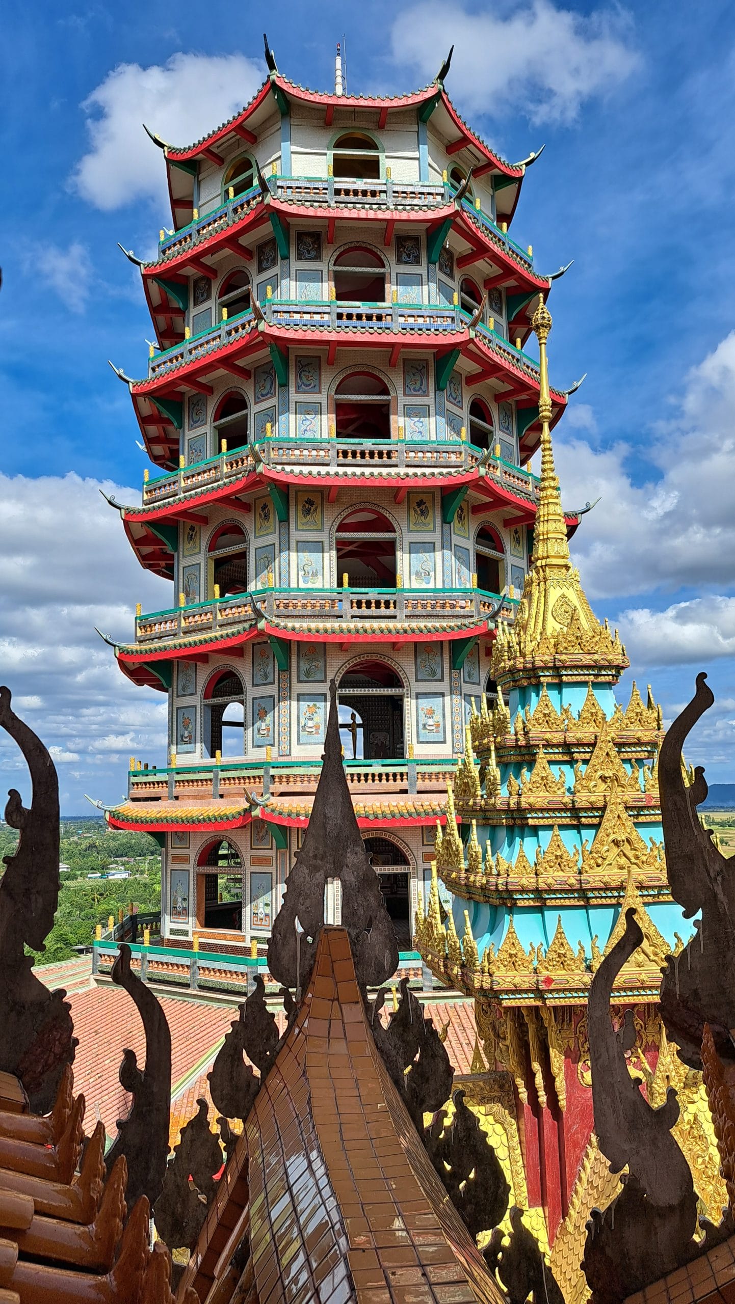 Terug in het hotel hebben we erge trek in een fruitshake. Ze zijn hier ook zo lekker. Als we een beetje op temperatuur zijn gekomen, bestellen we een Grab om ons naar de Wat Tham Suea (Tiger Cave Temple) te brengen. Dit enorme tempelcomplex ligt op een half uurtje rijden van het guesthouse, net buiten de stad. De Wat Tham Suea staat op een plateau. Om boven in de tempel te komen moeten we eerst 150 traptreden beklimmen. Boven aangekomen hebben we vanaf het plateau een mooi uitzicht op de vallei waarin Kanchanaburi ligt. Verspreid over het tempelcomplex staan een aantal kleinere tempels, een pagode van acht verdiepingen hoog en een enorm Boeddhabeeld van bijna 70 meter. Een pagode is een toren die uit verschillende, steeds kleiner wordende verdiepingen met een eigen dak bestaat. Pagodes zijn in veel boeddhistische tempels in Thailand te zien. We kunnen via smalle wenteltrappen in de pagode bijna helemaal boven komen. Hier kunnen we het enorme beeld in zijn geheel fotograferen, wat een heel mooi plaatje oplevert.