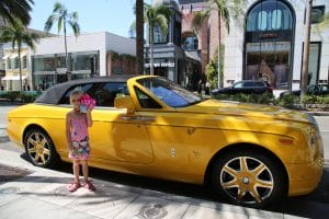 2019 USA: Rodeo Drive – kanariegele Rolls Royce van designer Bijan.