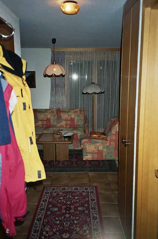 Om ongeveer 14:00 uur kwamen we dan eindelijk aan bij ons appartement in Saas Grund. We waren er echt precies op tijd, want onderweg was Mascha erg misselijk geworden en had, net als Dave, enorme buikkrampen. Toen we in het appartenement waren moest Dave ook rennen naar de wc om over te geven. We hadden allebei goede buikgriep. We hebben geprobeerd om onze bagage boven naar boven te sjouwen, maar dit lukte niet echt omdat we telkens naar de wc moesten rennen. We zijn toen maar in bed gaan liggen tussen alle troep in. Rob en Wil hebben toen de rest van de bagage naar boven gebracht.